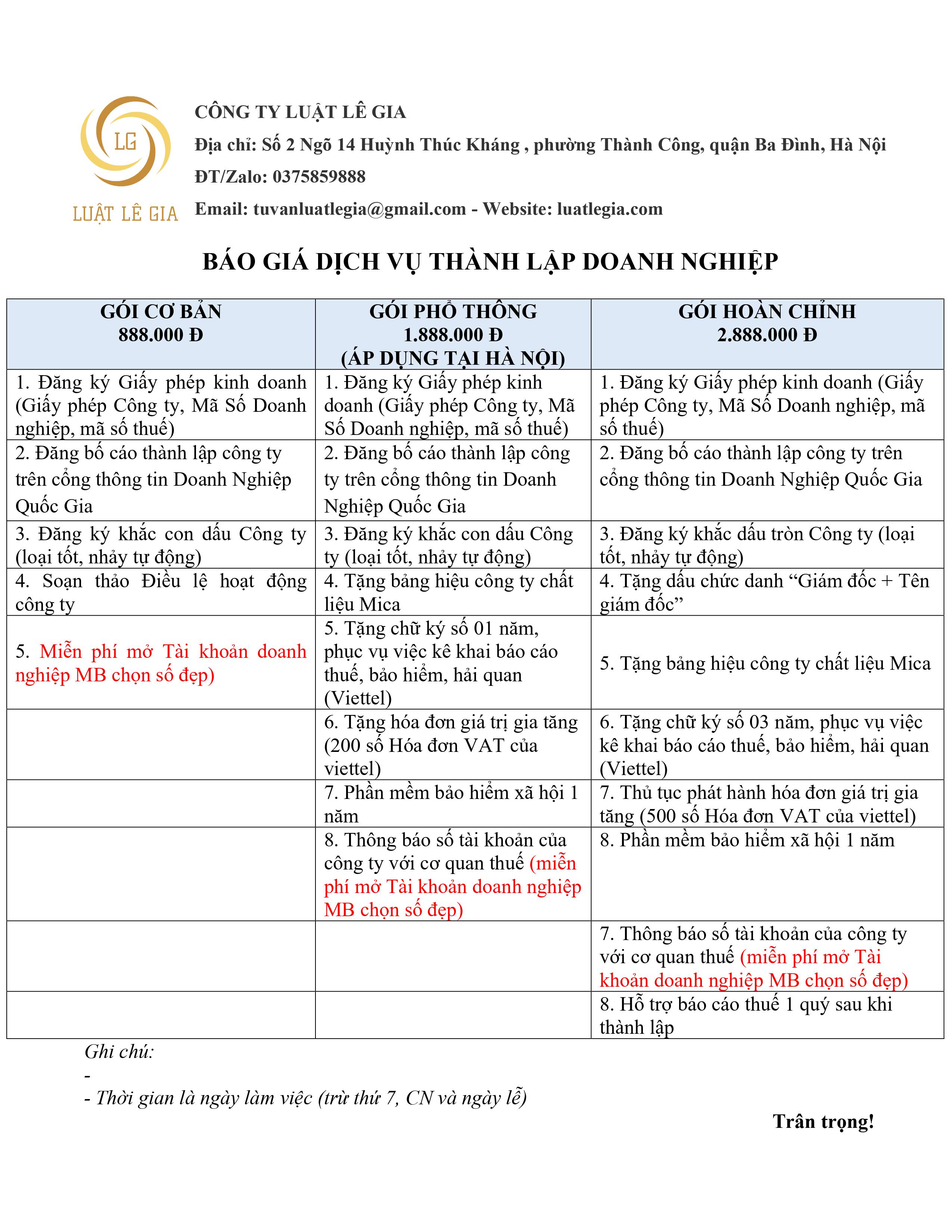 Chi phí tư vấn mở công ty của Luật Lê Gia có 3 mức giá là 888.000đ – 1.888.000đ – 2.888.000đ. Mỗi mức giá sẽ có thời gian hoàn thành và ưu đãi khác nhau. Quý khách hàng có thể cân đối với nhu cầu và khả năng tài chính của mình để lựa chọn mức giá phù hợp. Cụ thể báo giá tư vấn thành lập doanh nghiệp và ưu đãi riêng quý khách hàng có thể xem ở ảnh dưới: